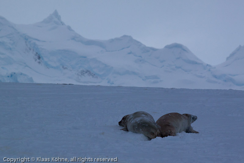 Zwei Krabbenfresserrobben (Lobodon carcinophagus) auf Schneeboden in Rückansicht mit Gletscherbergen im Hintergrund.