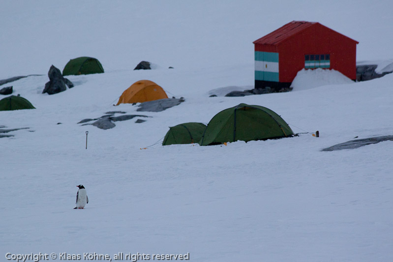 Einzelner Eselspinguin (Pygoscelis papua) vor einem Zeltlager und einer roten argentinischen Hütte in Dorian Bay.
