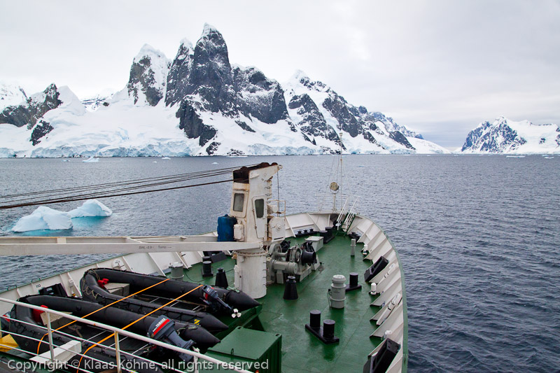 Bug der "Lyubov Orlova" am Beginn des Lemaire Channels mit eindrucksvollen Basaltgipfeln im Hintergrund