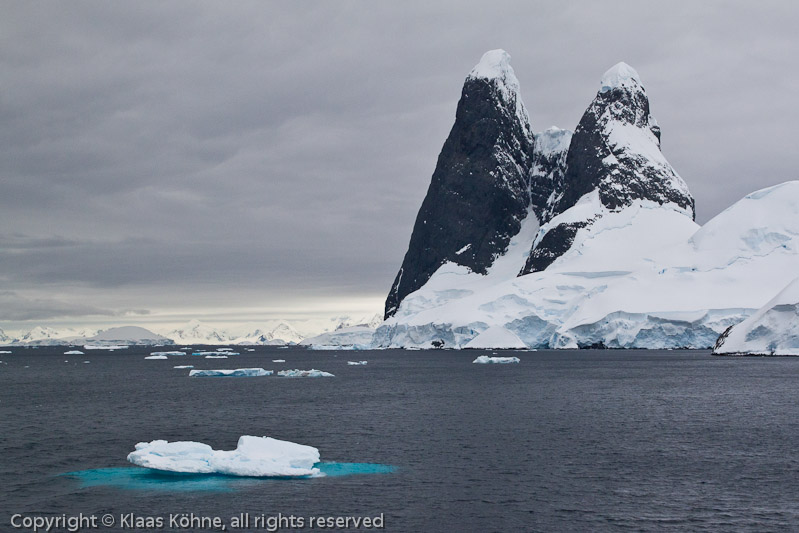 Verschneiter Doppelgipfel "Una´s Tits" aus dunklem Basalt mit Gletscher und blautürkisem Eisberg im Vordergrund vor grauem Himmel..