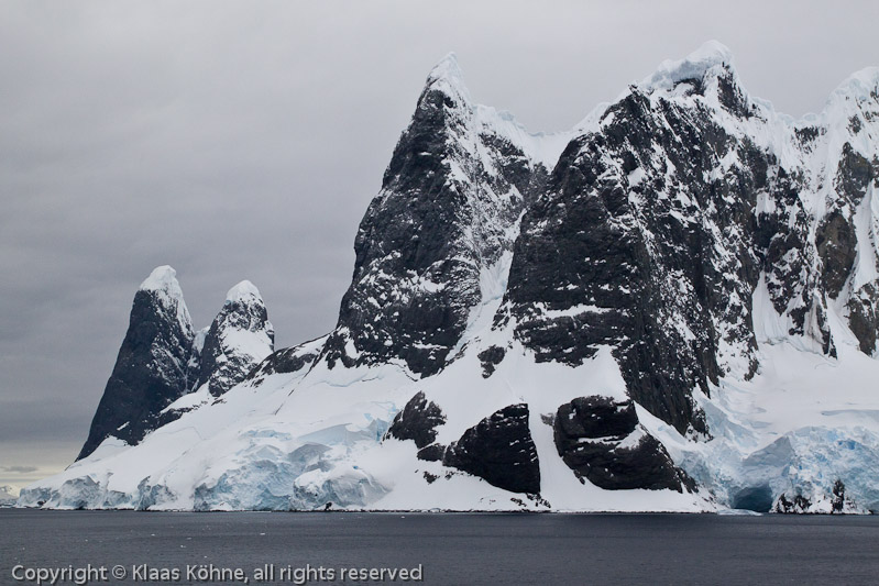 Gruppe von dunklen, verschneiten Basaltgipfeln mit eingelagerten Gletschern am Eingang des Lemaire Channels.