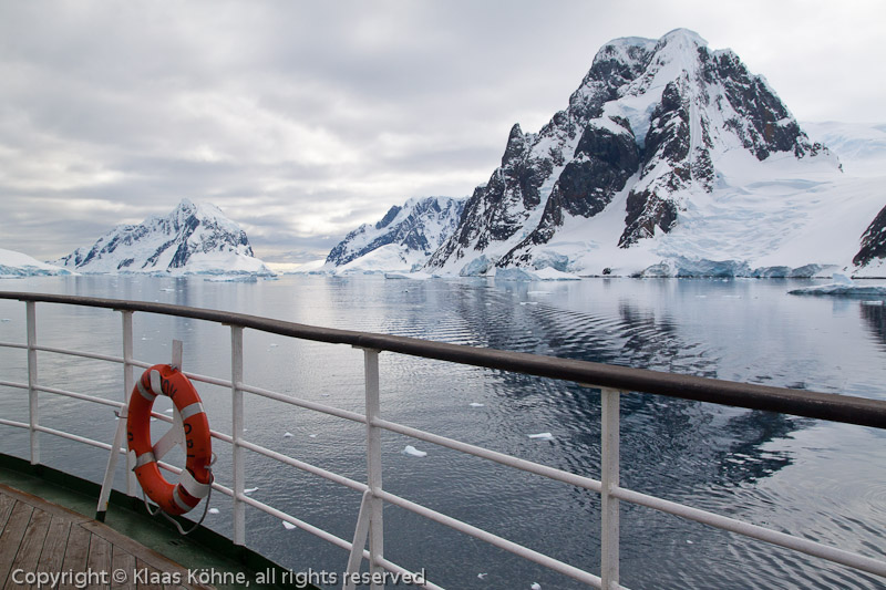 Mt. Scott an der Penola Strait mit der Reling und einem Rettungsring der "Lyubov Orlova" im Vordergrund und dem Lemaire Channels im Hintergrund.