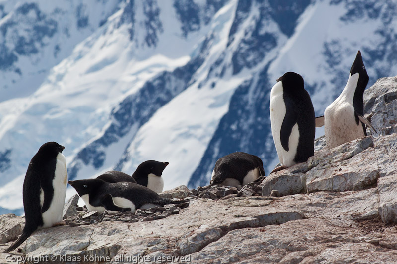 Gruppe von sieben Adeliepinguinen (Pygoscelis adeliae) vor der Wand eines Schneeeberges, teils stehend, teils brütend.