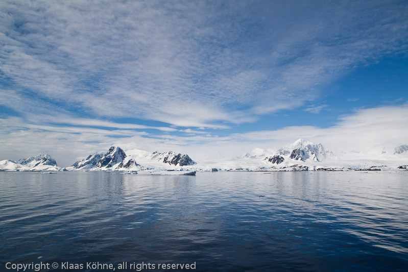 Weitwinkelaufnahme der Penola Strait mit Schleierwolkern am Himmel sowie Mount Scott und Mount Shackleton im hintergrund.