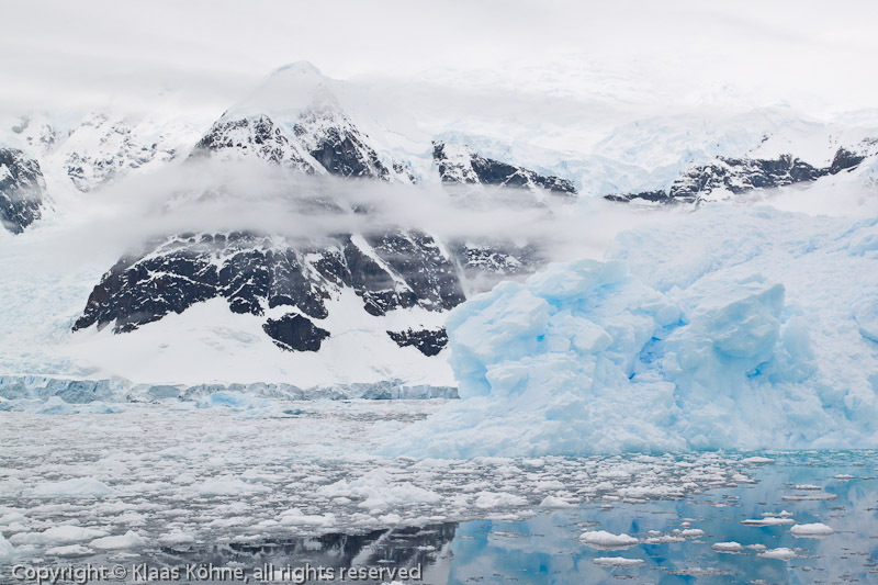 Großer blauer Eisberg vor der teilweise wolkenverhangenen Bergkulisse von Paradise Harbour.