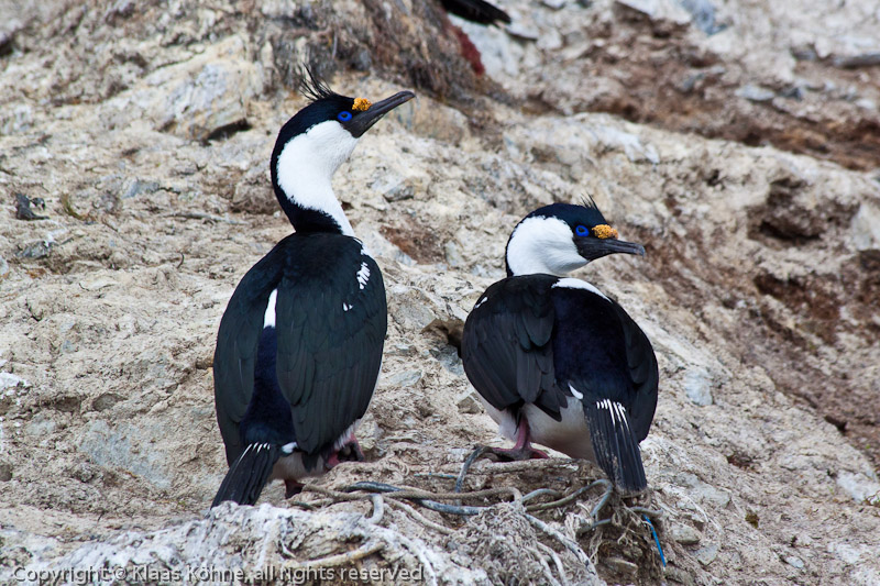 Teleaufnahme eines Paares von adulten Antarktischen Kormoranen (Phalacrocorax atriceps) in der Nähe der argentinischen Station Brown.