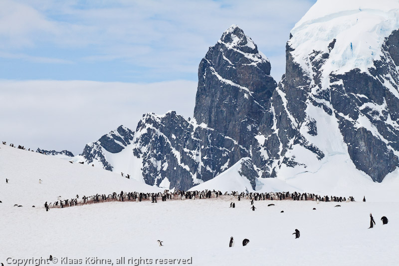 Kolonie von Eselspinguinen (Pygoscelis papua) auf Cuverville Island vor den Felsbergen der Arctowski Peninsula.
