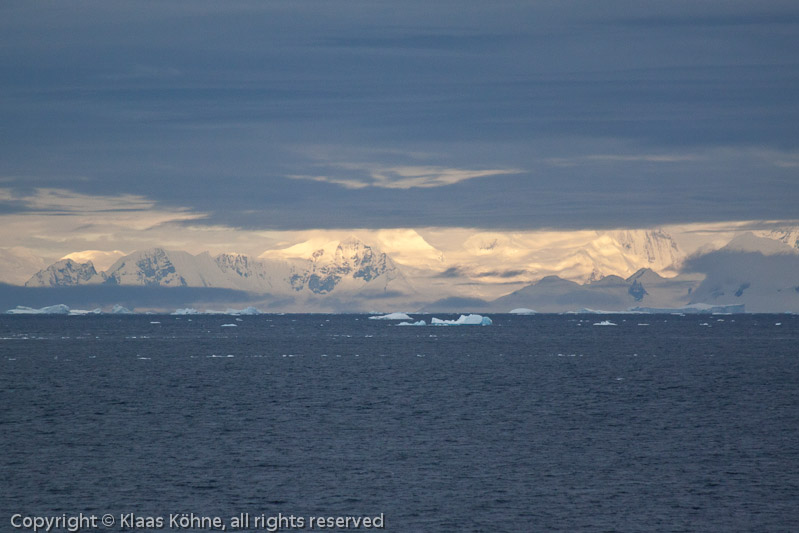 Bedeckter Himmel über dem grauen Wasser der Gerlache Strait mit Blick auf die noch sonnenbeschienenen Schneeberge der Antarktischen Halbinsel.
