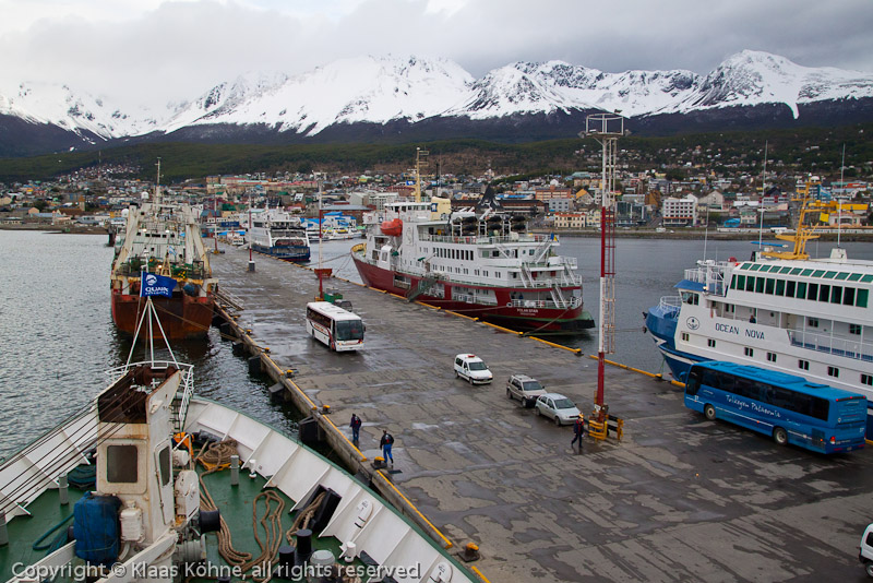Blick von der einlaufenden "Lyubov Orlova" auf den Hafen von Ushuaia mit einigen angedockten Antarktis-Kreuzfahrtschiffen und Schneebergen im Hintergrund.