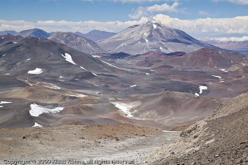 Kurz vor dem Sattel. Pause auf 6413m. Noch 245 Höhenmeter. Ich kann meine Traverse nochmal mit den Augen abgehen. Außer dem Incahuasi und dem Fraile ist etwas oberhalb der Bildmitte der schwarze Kegel zu erkennen. Sogar der San Francisco ist wieder aufgetaucht (links). Lang ist´s her...