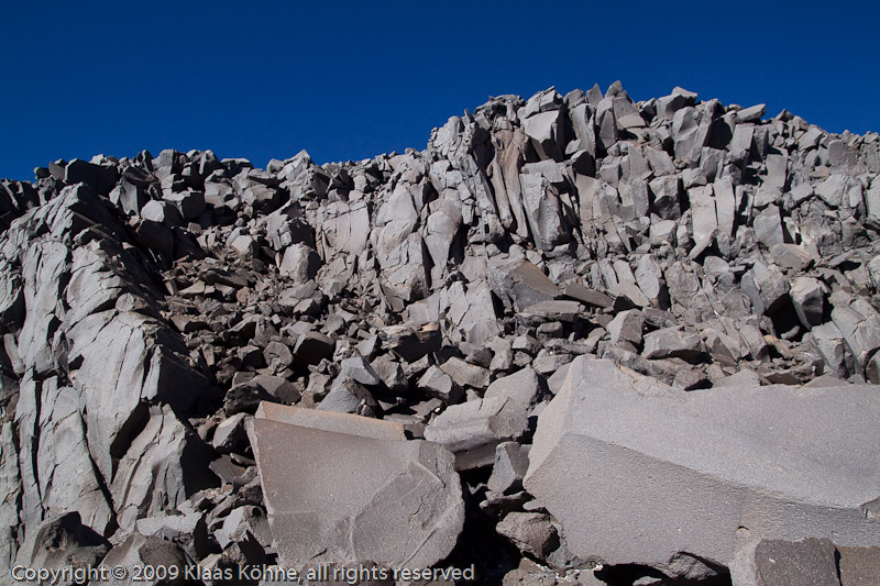 Das ist der Kandidat für den dritten Versuch. Tja, wo geht´s rauf? Ist alles sehr schlecht ausgeschildert hier oben. Ich lasse fast alles unten und klettere einfach so rauf. Na toll, noch ein Verhauer. Wieder ein Stück runter und eine andere Route rauf. Der Wind pfeift und oben ist es ganz schön ausgesetzt. Kann nicht behaupten, dass ich mich hier oben wohlfühle. Aber die Sache muss hier und heute geklärt werden. Und dieser Turm ist endlich der Richtige! Um kurz nach halb sechs bin ich am höchsten Punkt einer Vulkanruine namens Cazadero. Was für eine wilde Position hier oben auf 6658m, dem neunthöchsten Gipfel Amerikas! Und der hat´s mir auch ganz schön gegeben. Toller Blick über die anderen Gipfelaufbauten, leider liegt meine Kamera unten. Hm, oder war der allererste Zacken doch höher? Mist, das muss ich nochmal kontrollieren, sonst beschäftigt mich das wieder ewig...