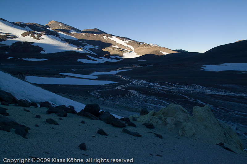 Es wird flacher. Vorne rechts ein paar Schwefelbrocken.