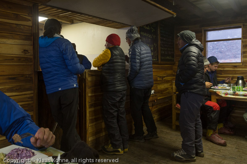 Essensausgabe im Refugio. Ein gutes Dutzend Menschen wird morgen am Berg unterwegs sein. Viel weniger, als ich befürchtet habe.