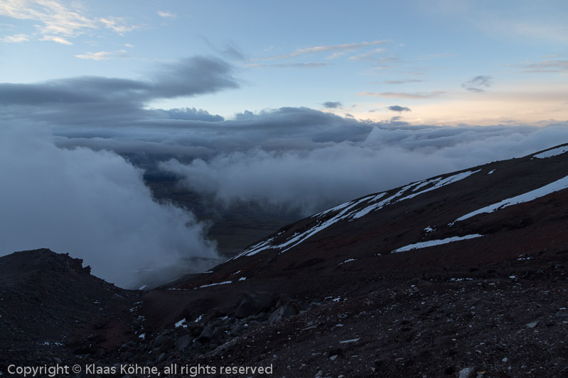 Abenddämmerung am Cotopaxi. Beeindruckende Wolkenstimmung und die üblichen gemischten Gefühle.