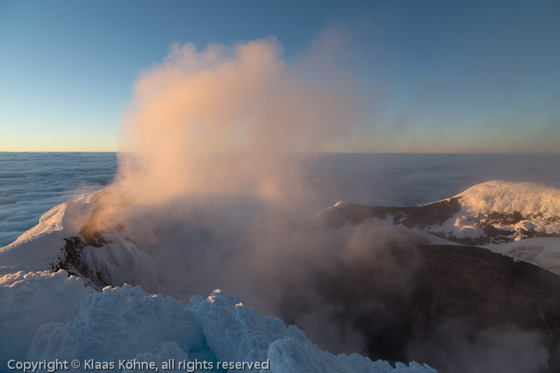 Die ersten Sonnenstrahlen beleuchten die Dampfwolken, die unablässig aus dem Krater aufsteigen - ein toller Anblick!