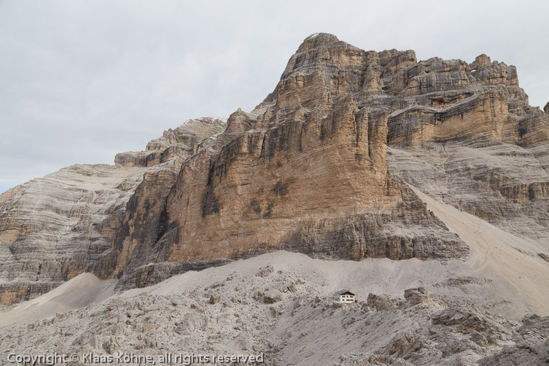 Der erste Teil ist noch recht unproblematisch. Oberhalb der Hütte baut sich die Tofana di Mezzo auf.