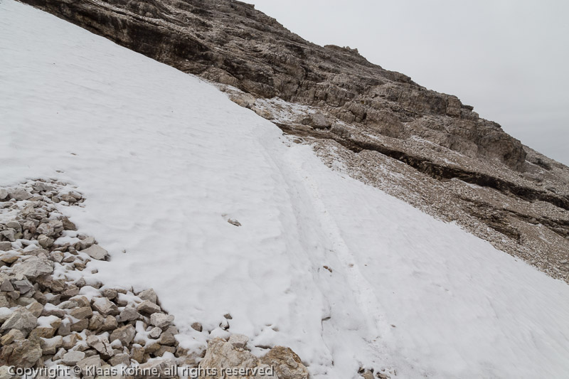 Aha, das erste Schneefeld! Weil der Schnee ziemlich hart ist und ein Ausrutscher höchst unerfreuliche Folgen haben könnte, lege ich lieber die Steigeisen an. Dafür habe ich sie schließlich mitgenommen.