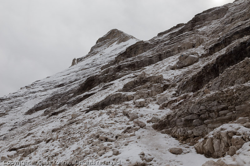 Eigentlich hatte ich geplant, die Eisen nach dem Schneefeld wieder abzulegen, aber daraus wird nichts. Das weitere Gelände sieht nämlich teiweise recht heikel vereist aus.