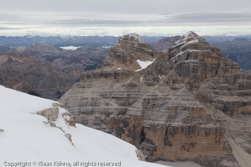 Im Nordosten sind die beiden anderen Tofana-Gipfel zu sehen. Links die "Dentro" (3238m) und rechts wieder die "Mezzo", beide nur ein paar Meter höher als mein aktueller Standort.