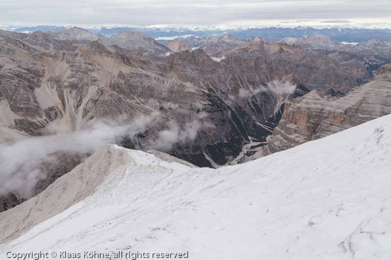 Langsam wird der Gipfelhang flacher. Trotzdem muss ich jeden Schritt bewusst setzen, denn bei einem Ausrutscher würde es auf diesem Gelände zügig abwärts Richtung Westwand gehen. Ich habe mal gelesen: "Make every step count. There are no unimportant steps!" Genauso ist es...