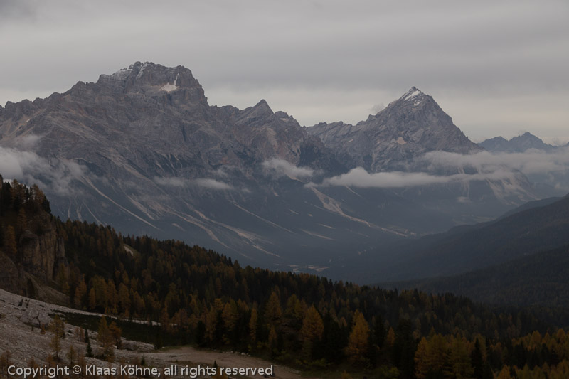 Es ist nicht mehr weit bis zur Baumgrenze. Sorapis und Antelao grüßen von der anderen Talseite herüber.