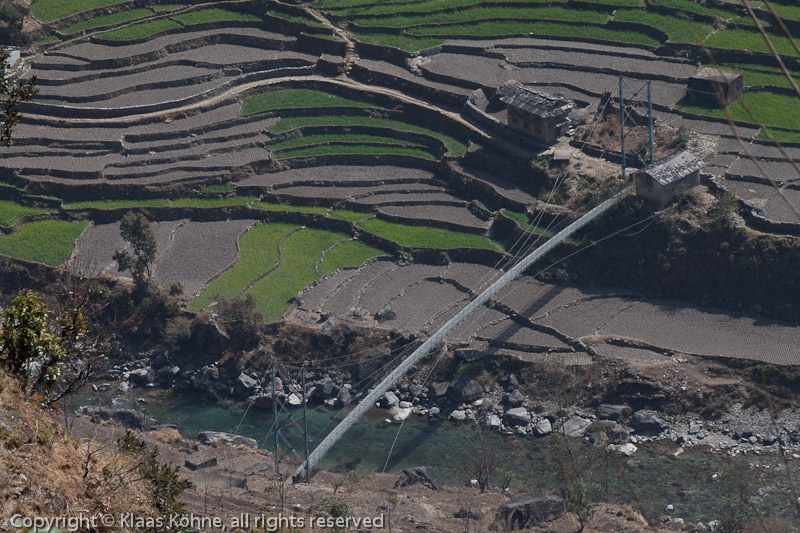 Weit unten eine Hängebrücke über den Likhu Khola. Müssen wir da drüber? Sieht zum Glück nicht so aus.