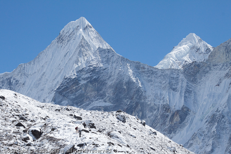 Drei kleine Trekker vor zwei mächtigen Sechstausendern. Der linke heißt Malangphulang und ist 6571m hoch. Der rechte hat keinen allgemein bekannten Namen, ist aber auch satte 6467m hoch.