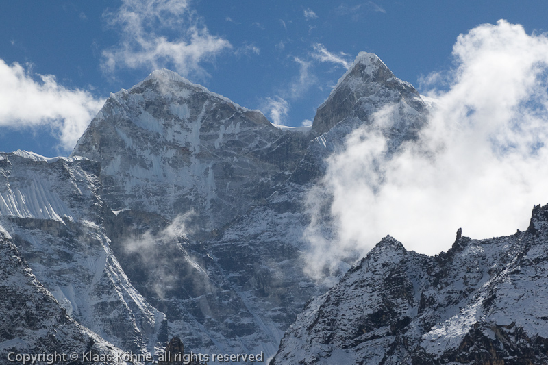 Wolken vor der beeindruckenden Ostwand des Kangtega