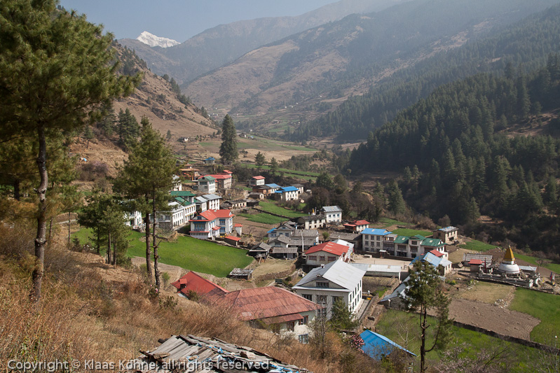 An der Stupa (rechts) komme ich mit einer hübschen Sherpani in´s Gespräch. Leider habe ich nicht sehr viel Zeit und verabschiede mich bald. Aber: Surprise! Am Ortsausgang sehe ich sie wieder! Wie ist sie da denn so schnell hingekommen? Mehr als ein paar Minuten Zeit nehme ich mir aber auch diesmal nicht. Und für den Rest des Tages denke ich darüber nach, ob das nicht ein Fehler war...
