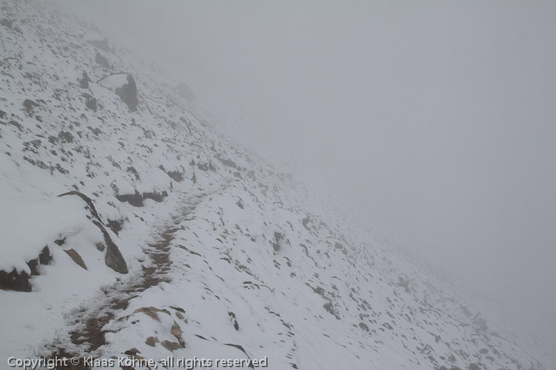 Neblige Traverse am Hang entlang. Der Weg ist weiterhin gut. Auf einem Matschpfad, vielleicht noch mit Sturm, wäre das hier durchaus heikel.