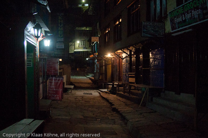 Meine heutige Zielgerade. Hier brummt tagsüber der Kommerz. Um kurz vor neun bin ich wieder in der Yak-Lodge. Fast vierzehn Stunden war ich unterwegs - nur wegen einer fehlenden Querverbindung auf der Karte. Nein, das wäre zu simpel argumentiert. Schließlich waren ja auch wunderbare Ausblicke dabei. Allerdings wäre es wohl vernünftiger gewesen, spätestens in Dole umzukehren bzw. nach Phortse zu gehen, als das Gokyo-Tal hinauf. EGAL! Es war ein weiterer unvergesslicher Tag im Himalaya!
