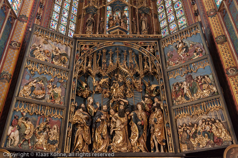 Das Prunkstück der Marienkirche, der berühmte Altar von Veit Stoß. Dieses Polyptychon gilt als eines der bedeutendsten Kunstwerke der europäischen Spätgotik. Von 1477 bis 1489 wurde daran gearbeitet. Im geöffneten Zustand ist er rund 13m hoch und 11m breit - wahrlich beeindruckend!