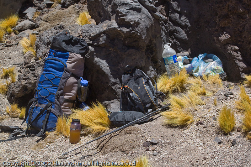 Nach etwa sechs Stunden erreiche ich endlich mein Depot. Aber nach kurzer Pause geht es weiter. Der Pass ist noch weit. Im wesentlichen bleibt das Depot so, wie es ist. Morgen hole ich dann den Rest ab. Zum Glück hält sich der Wind noch in Grenzen.