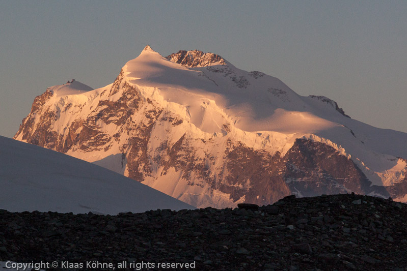Das Monte-Rosa-Massiv im ersten Sonnenlicht. Im linken Teil ist die Capanna Margherita erkennbar, die mit 4554m höchstgelegene Hütte Europas. 2002 war ich mal kurz dort zu Besuch. Lang ist´s her.