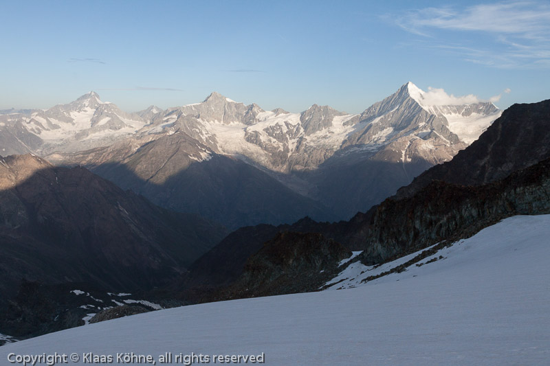 Kurz vor dem Alphubeljoch noch einmal der Blick auf die treuen Begleiter beim bisherigen Aufstieg. Für Experten mit scharfen Augen ist auch die Täschhütte wieder zu erkennen...