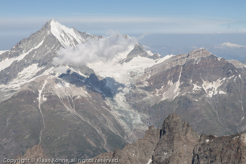 Auch das Weißhorn ist wieder aufgetaucht - noch exakt 300 Meter höher. Rechts das Brunegghorn (3883m).