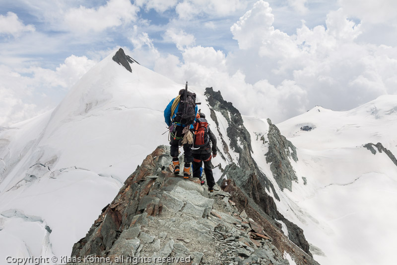 Dies sind Spanier auf dem Weg in´s Feejoch. Der Grat ist natürlich nicht schwierig, aber bei der (im Bild nicht so gut erkennbaren) Ausgesetzheit wäre mir mal wieder etwas flau in der Magengend...