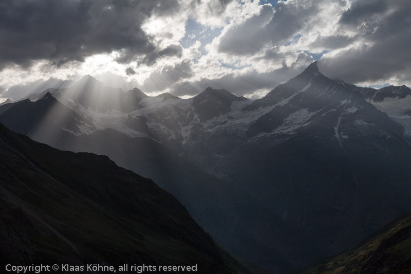 Nach drei Stunden hat sich das Wetter wieder beruhigt. Der Blick auf Weißhorn & Co. entschädigt etwas für die bangen Momente vorhin.