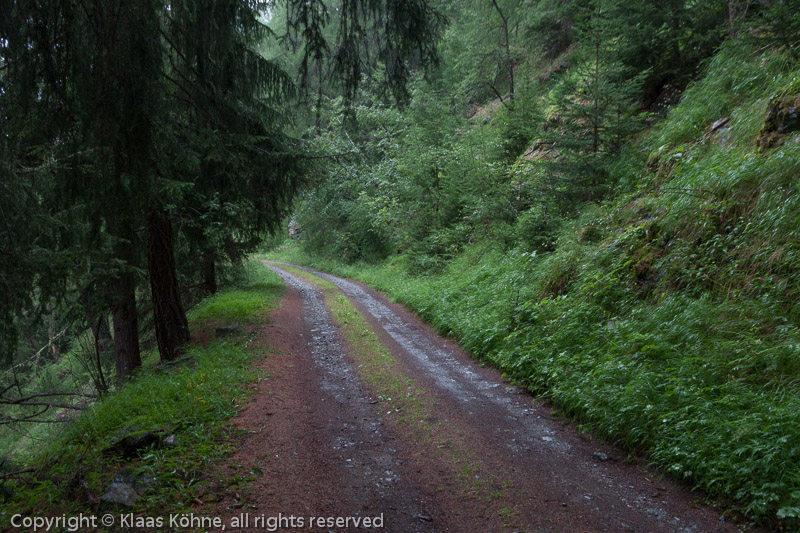 Im nassen Wald oberhalb von Täsch. Tja, gestern um diese Zeit standen wir in arktischer Umgebung auf dem Feekopf. What a change of scenery!