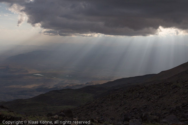 Um zehn nach zwei bin ich zurück im Basislager. Erstmal im Zelt ausstrecken und dösen, später herumgehen, quatschen, Kaffee trinken, Kekse essen. Entspannte "Sense-of-achievement-Stimmung". Um kurz vor sechs ergibt sich noch ein schönes Lichtspiel über dem Tal. So lässt sich´s aushalten!