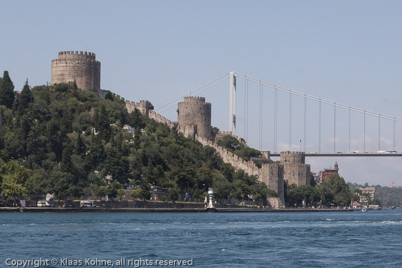 Das ist die Rumeli Hisari, die "Europäische Festung". Sie wurde 1452 vom Sultan Mehmed II. errichtet, um Konstantinopel vom Nachschub aus dem Schwarzen Meer abzuschneiden. Im folgenden Jahr gelang ihm dann auch die Eroberung der Stadt und er trug anschließend den Namenszusatz "Fatih", was "Eroberer" bedeutet.