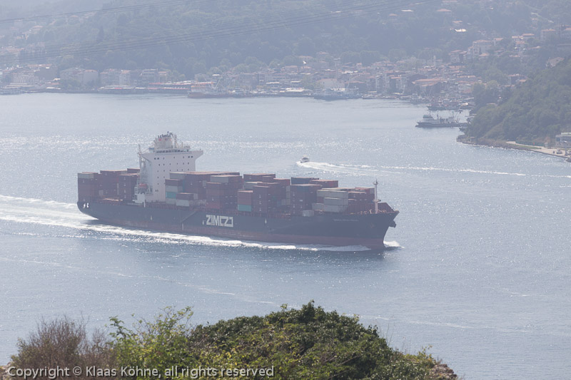 Auch dieses große Containerschiff hat die Bosporus-Passage fast geschafft.