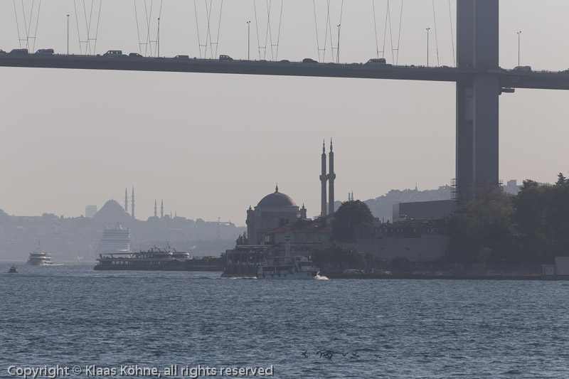 Kurz vor der Atatürk-Brücke mit Blick auf die Moschee von Ortaköy. In der Ferne grüßt schon die Sülemaniye-Moschee.