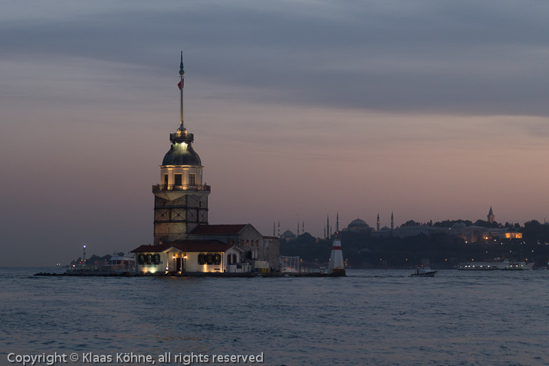Hinter dem Kiz Kulesi erkennt man die Blaue Moschee, die Hagia Sophia und den Topkapi-Palast (von links nach rechts).