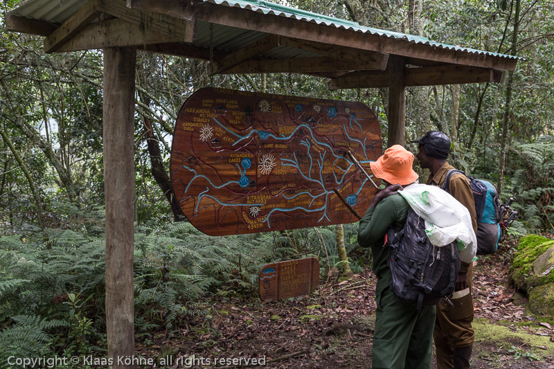 Infotafel an der wichtigen Weggabelung oberhalb der Nyabitaba-Hütte. Geradeaus geht es das Mubuku-Tal hoch. Wir müssen aber rechts runter, um das Bujuku-Tal zu erreichen. Wenn alles gut geht, kommen wir dann in einer knappen Woche auf dem "Mubuku-Weg" wieder hier vorbei.