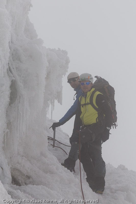 Etwa eine Stunde später haben wir den steilsten (ca 30-35°) Teil des Margherita-Gletschers überwunden. Kurz vor dem Sattel zwischen Alexandra und Margherita biegen wir nach rechts ab und stehen schließlich vor den Eisvorhängen, für die der Ruwenzori so bekannt ist.