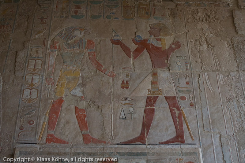 Relief im Tempel von Montuhoteps II. . Links die Gestalt des Horusfalken.