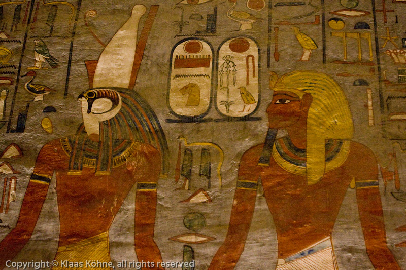 Links eine Horusdarstellung, in der Mitte zwei Kartuschensiegel des Pharaos