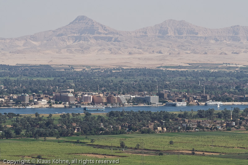 Wieder nach draußen. Oberhalb der Grabanlagen im Tal der Könige hat man diesen Blick auf Luxor und den Nil.