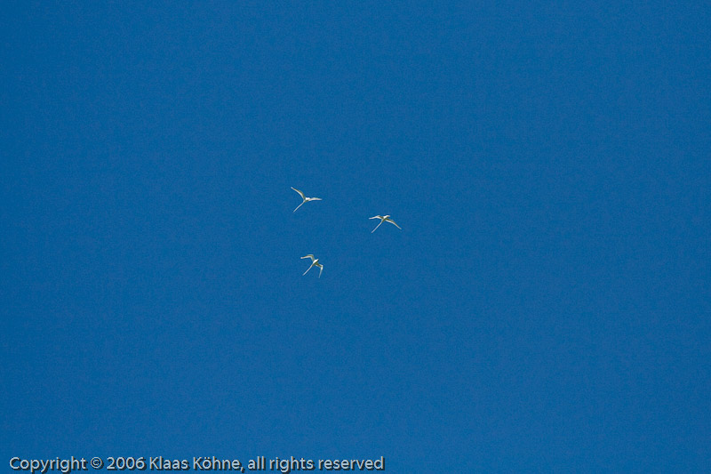 Der Himmel am nächsten Tag: Drei weiße Seeschwalben ziehen ihre Kreise.